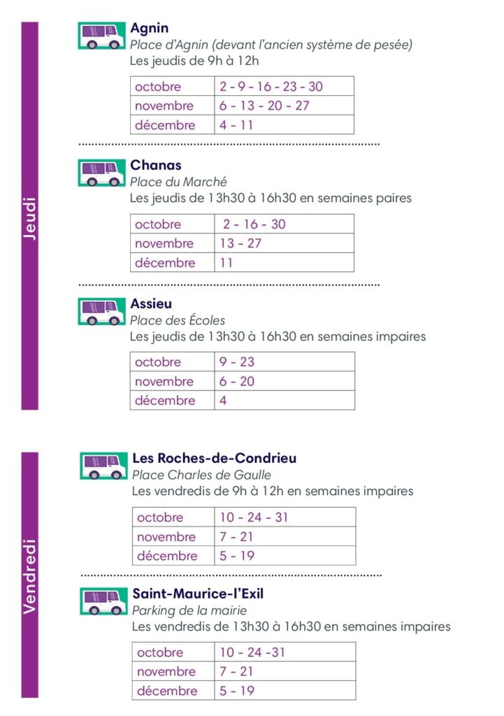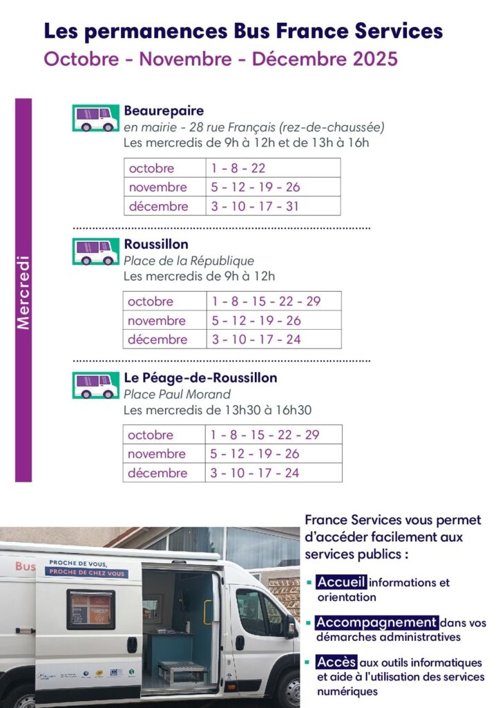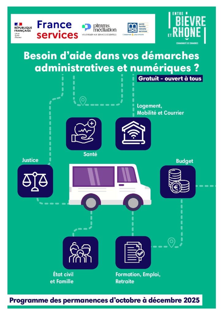 Retrouvez ci-dessous les dates, horaires et lieux des permanences des bus France Services sur le territoire d’Entre Bièvre et Rhône pour la période d’octobre à décembre 2025.