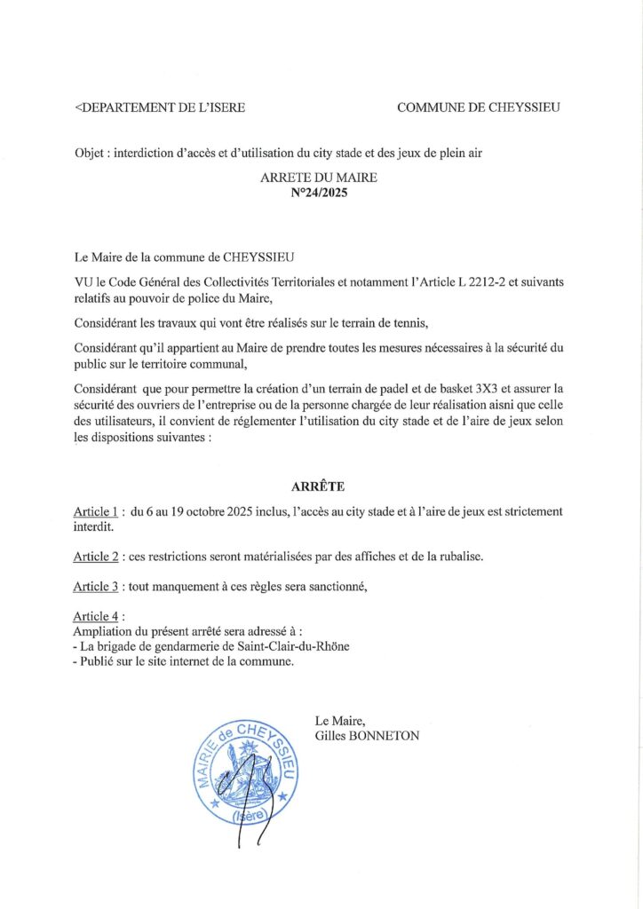 Veuillez trouver ci-dessous l’arrêté municipal interdisant l’accès au city stade ainsi qu’à l’aire de jeux.