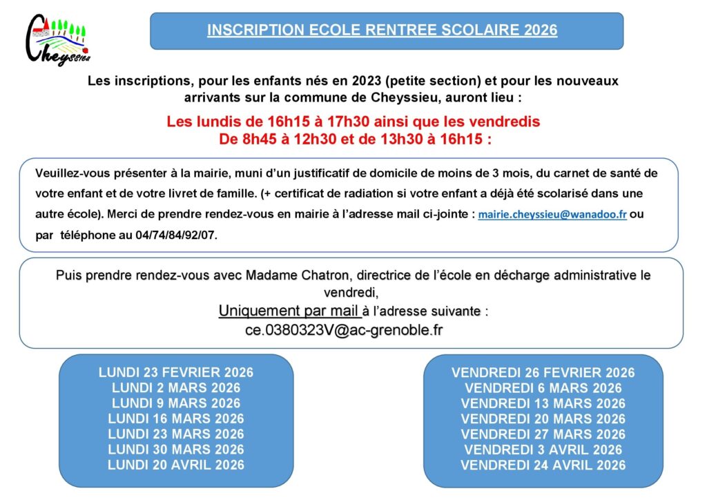 Les inscriptions, pour les enfants nés en 2023 (petite section) et pour les nouveaux arrivants sur la commune de Cheyssieu, auront lieu :