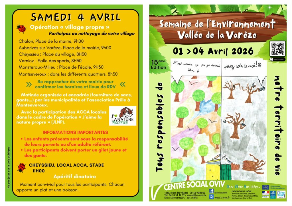 Du 1er au 04 avril 2026, l’ensemble des villages de la vallée de la Varèze se mobilise pour la 15ème édition de la semaine de l’environnement avec de nombreuses activités visant à sensibiliser petits et grands à la protection de la nature.